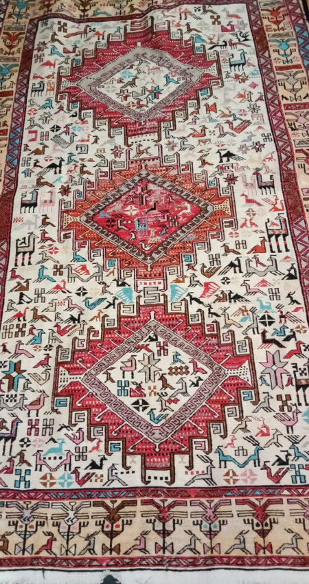 HISTORY: From the Sivas region - hand made in the late 20th century. Features three geometric medallions surrounded by tribal animal motifs, symbols of protection, and stylized birds. A rare example of silk weaving with strong nomadic character, combining high knot density with traditional Anatolian storytelling. Ideal size for a wall hanging or collectors framing.