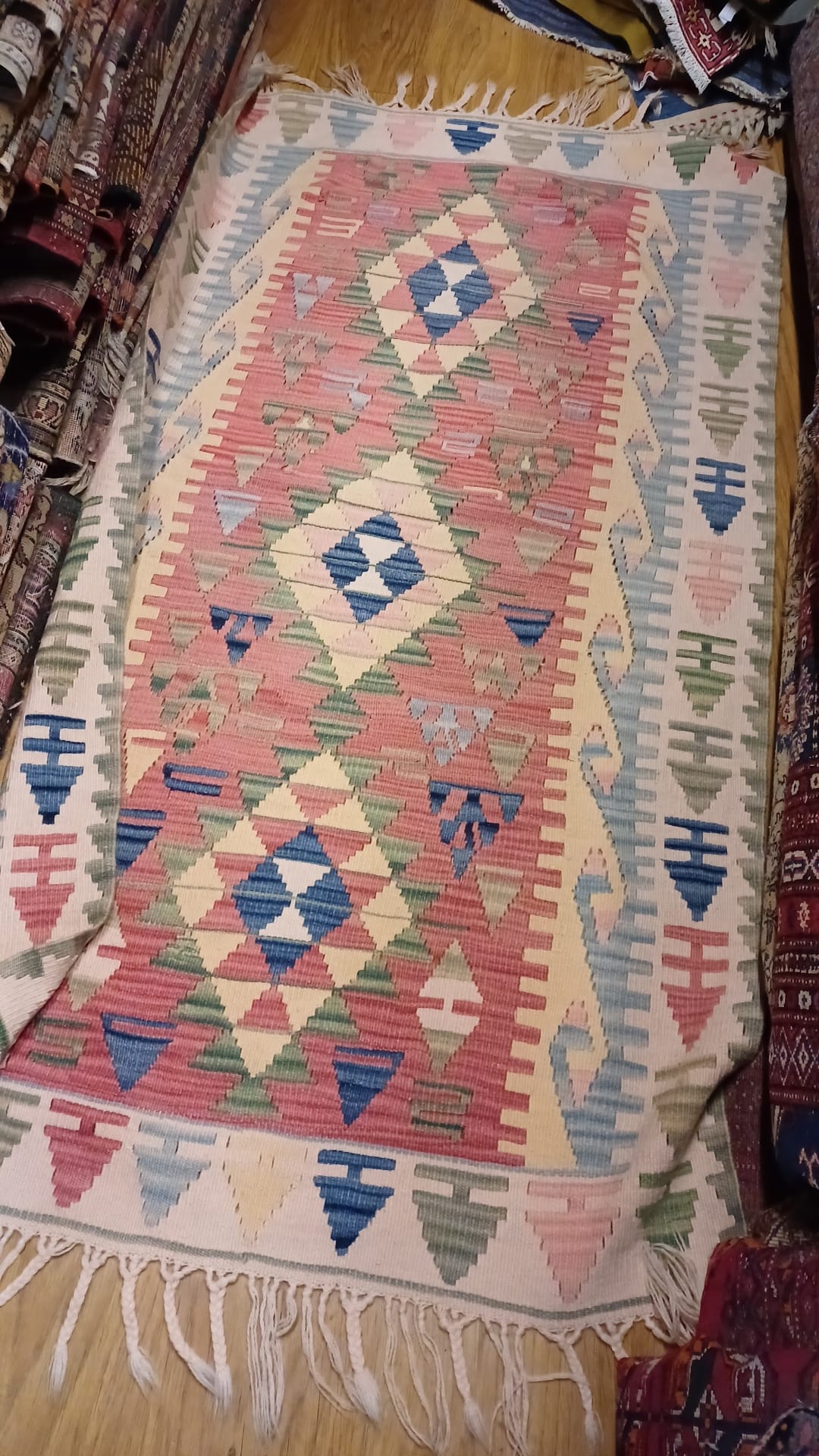 HISTORY: From the Esme region village loom woven, pastel tones of rose, indigo, and soft green. Features classic Anatolian motifs—hooked diamonds, protective amulets, and comb borders—in a symmetric flatweave layout.